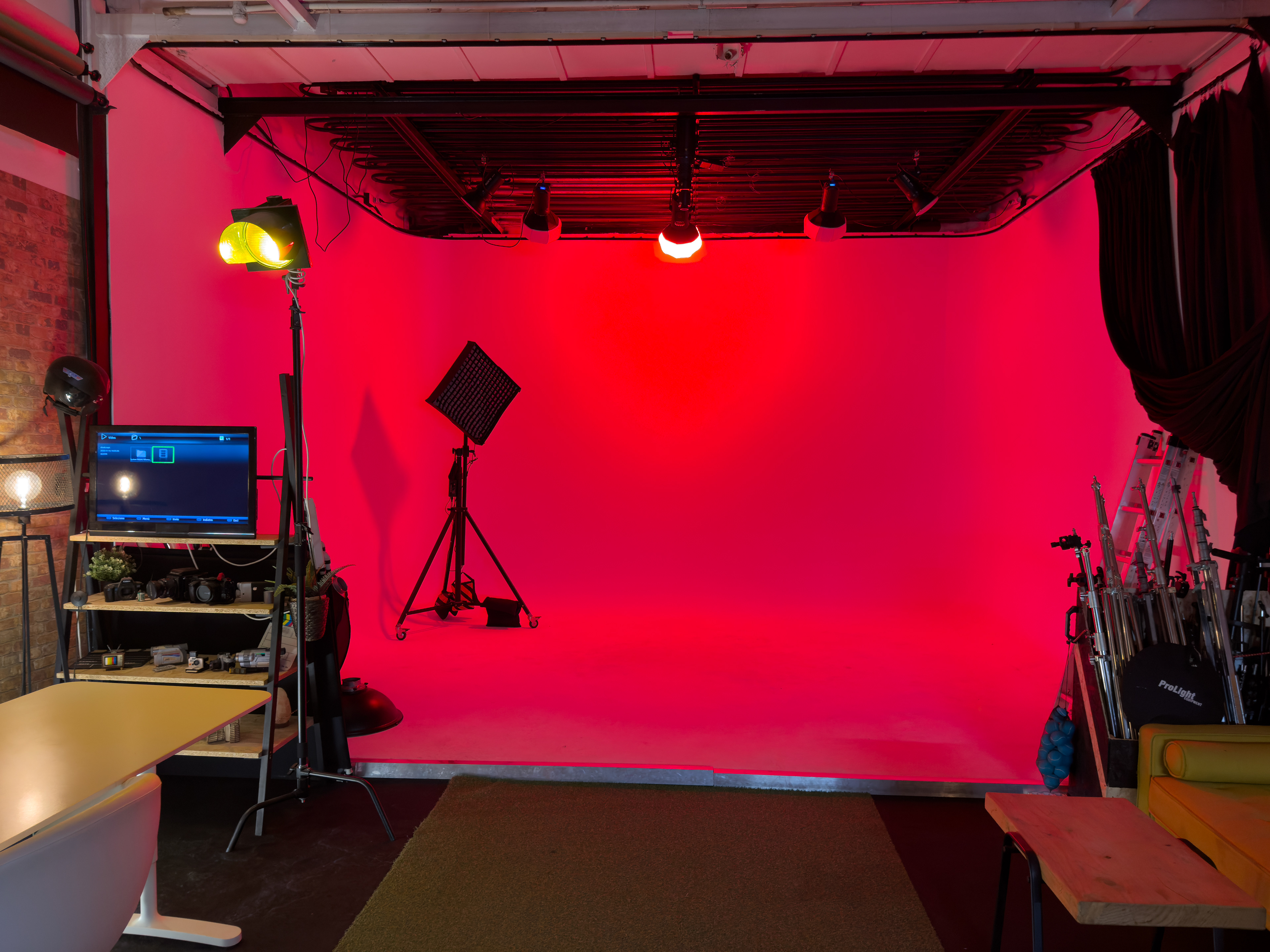 Illuminazione Professionale: La sala è equipaggiata con un sistema di illuminazione avanzato, regolabile e versatile. Questo permette di ottenere l'illuminazione ideale per qualsiasi progetto fotografico o video, assicurando che ogni dettaglio sia perfettamente visibile.